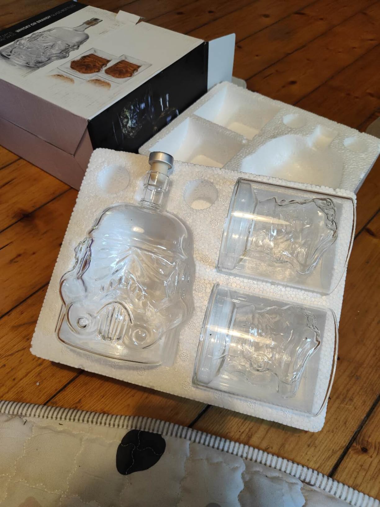 Als Star Wars Fan ist die Whiskey Karaffe in Stormtrooper-Form quasi ein Must-Have für die eigene Bar daheim. Es ist toll, dass auch die beiden Gläser innen das gleiche Design haben und so ein cooler Effekt entsteht. Die Karaffe ist auf jeden Fall ein echter Hingucker. Alles kommt auch sicher verpackt an, sodass Transportschäden quasi ausgeschlossen sind. Ein bisschen enttäuscht war ich darüber, wie sich die Flasche und die Gläser anfühlen. Es wirkt eher wie Hartplastik und nicht wie schweres Glas. Da fehlt mir dann fürs Whiskey-Trinken ein wenig das Feeling. Insgesamt ist es jedoch ein klasse Merchandise, dass sich auch super verschenken lässt.